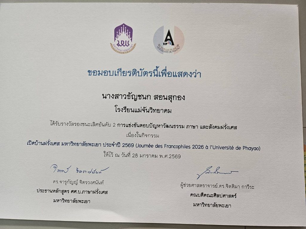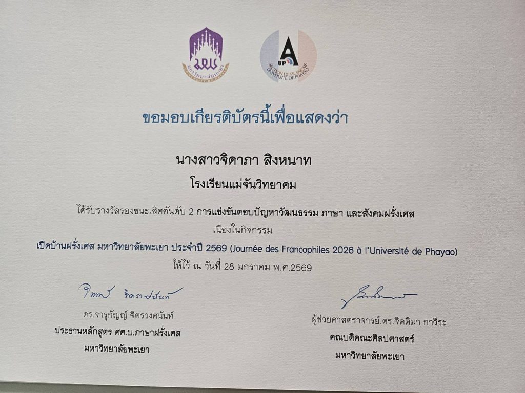 ในวันที่ 28 มกราคม 2569 นายกุศล มีปัญญา ผู้อำนวยการโรงเรียนแม่จันวิทยาคม มอบหมายให้ นางสาววรัญญา จันทร์ธีระโรจน์ ครูกลุ่มสาระการเรียนรู้ภาษาต่างประเทศ วิชาภาษาฝรั่งเศส นำนักเรียนตัวแทนแผนการเรียนภาษาฝรั่งเศส เข้าร่วมการแข่งขันเนื่องในกิจกรรม เปิดบ้านภาษาฝรั่งเศส มหาวิทยาลัยพะเยา ประจำปีการศึกษา 2569 ณ คณะศิลปศาสตร์ มหาวิทยาลัยพะเยา การจัดกิจกรรมดังกล่าวมีวัตถุประสงค์เพื่อเปิดโอกาสให้นักเรียนระดับชั้นมัธยมศึกษาที่มีความรู้ด้านภาษาฝรั่งเศส ได้แสดงความสามารถและศักยภาพทางวิชาการ พร้อมทั้งแลกเปลี่ยนเรียนรู้ด้านภาษา วัฒนธรรม และสังคมฝรั่งเศส โดยผลการแข่งขัน นักเรียนโรงเรียนแม่จันวิทยาคมได้รับรางวัล ดังนี้ นางสาวธัญชนก สอนสุกอง เเละนางสาวจิดาภา สิงหนาท นักเรียนชั้นมัธยมศึกษาปีที่ 6/5 รับรางวัลรองชนะเลิศอันดับ 2 การแข่งขันตอบปัญหาวัฒนธรรม ภาษา และสังคมฝรั่งเศส นางสาวแก้ววิมล สิงธิสาร นักเรียนชั้นมัธยมศึกษาปีที่ 6/5 และนางสาวนันท์นลิน บุดดีคำ นักเรียนชั้นมัธยมศึกษาปีที่ 4/5 รับรางวัลรองชนะเลิศอันดับ 2 การแข่งขันวาดภาพ หัวข้อ “340 ความสัมพันธ์ไทย–ฝรั่งเศส” ระดับภาคเหนือ โดยทั้งสองรายการได้รับเงินรางวัล รายการละ 500 บาท นับเป็นความภาคภูมิใจของโรงเรียน คณะครู ผู้ปกครอง และนักเรียน อีกทั้งยังสะท้อนให้เห็นถึงศักยภาพด้านภาษาต่างประเทศของนักเรียน ตลอดจนผลสัมฤทธิ์จากการจัดการเรียนการสอนที่มุ่งพัฒนาผู้เรียนให้มีความรู้ ความสามารถ และพร้อมก้าวสู่เวทีทางวิชาการในระดับที่สูงขึ้นต่อไป