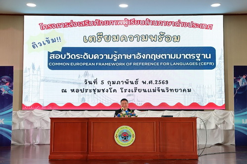 วันที่ 5 กุมภาพันธ์ 2569 นายกุศล มีปัญญา ผู้อำนวยการโรงเรียนแม่จันวิทยาคม เป็นประธานในพิธีเปิดกิจกรรมเตรียมความพร้อมเพื่อสอบวัดระดับความรู้ภาษาอังกฤษตามมาตรฐานสากล (CEFR) พร้อมกล่าวให้โอวาทและให้กำลังใจแก่นักเรียนที่เข้าร่วมกิจกรรม โดยมีคณะผู้บริหาร คณะครู และบุคลากรทางการศึกษา กลุ่มสาระการเรียนรู้ภาษาต่างประเทศ เข้าร่วมกิจกรรมอย่างพร้อมเพรียง ณ หอประชุมชงโค โรงเรียนแม่จันวิทยาคม กิจกรรมดังกล่าวจัดขึ้นตามโครงการส่งเสริมศักยภาพผู้เรียนด้านภาษาต่างประเทศ มีวัตถุประสงค์เพื่อเตรียมความพร้อมให้นักเรียนมีความรู้ ความเข้าใจ และทักษะด้านภาษาอังกฤษ ก่อนเข้ารับการสอบวัดระดับความรู้ภาษาอังกฤษตามกรอบมาตรฐาน Common European Framework of Reference for Languages (CEFR) ซึ่งเป็นมาตรฐานสากลที่ใช้ในการประเมินความสามารถทางภาษา ในการนี้ มีนักเรียนเข้าร่วมกิจกรรม จำนวนทั้งสิ้น 350 คน ประกอบด้วยนักเรียนระดับชั้นมัธยมศึกษาปีที่ 5 ห้อง 5/1, 5/2, 5/5, 5/5 และ 5/6 และนักเรียนระดับชั้นมัธยมศึกษาปีที่ 6 ห้อง 6/1, 6/2, 6/3, 6/4, 6/5 และ 6/6 โดยกิจกรรมเน้นการเสริมสร้างทักษะภาษาอังกฤษทั้งด้านการฟัง การพูด การอ่าน และการเขียน เพื่อยกระดับสมรรถนะผู้เรียนให้สอดคล้องกับมาตรฐานสากล และเตรียมความพร้อมสู่การศึกษาต่อและการใช้ภาษาในชีวิตจริง