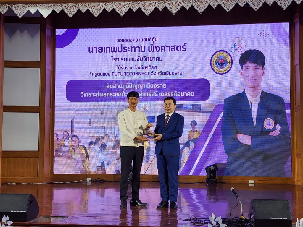 ในวันที่ 19 กันยายน 2568 นายกุศล มีปัญญา ผู้อำนวยการโรงเรียนแม่จันวิทยาคม มอบหมายให้ นายทัตเทพ จงอมรรัตน์ รองผู้อำนวยการโรงเรียน พร้อมด้วย นายเทพประทาน พึ่งศาสตร์ ครูกลุ่มสาระการเรียนรู้สังคมศึกษา ศาสนา เเละวัฒนธรรม เข้าร่วมพิธีปิดเเละรับโล่ผู้ขับเคลื่อนโครงการ Future Connect ยกระดับศักยภาพครูและนักเรียนในจังหวัดเชียงราย โดยใช้เทคโนโลยี AI เเละรางวัลครูต้นแบบFuture Connect จังหวัดเชียงราย โดยได้รับเกียรติจากท่าน ดร.นิรุตต์ บุตรแสนลี รองศึกษาธิการภาค 15 เป็นประธานการเป็นประธานในการปิดเเละมอบโล่รางวัล ณ หอประชุมโรงเรียนสามัคคีวิทยาคม